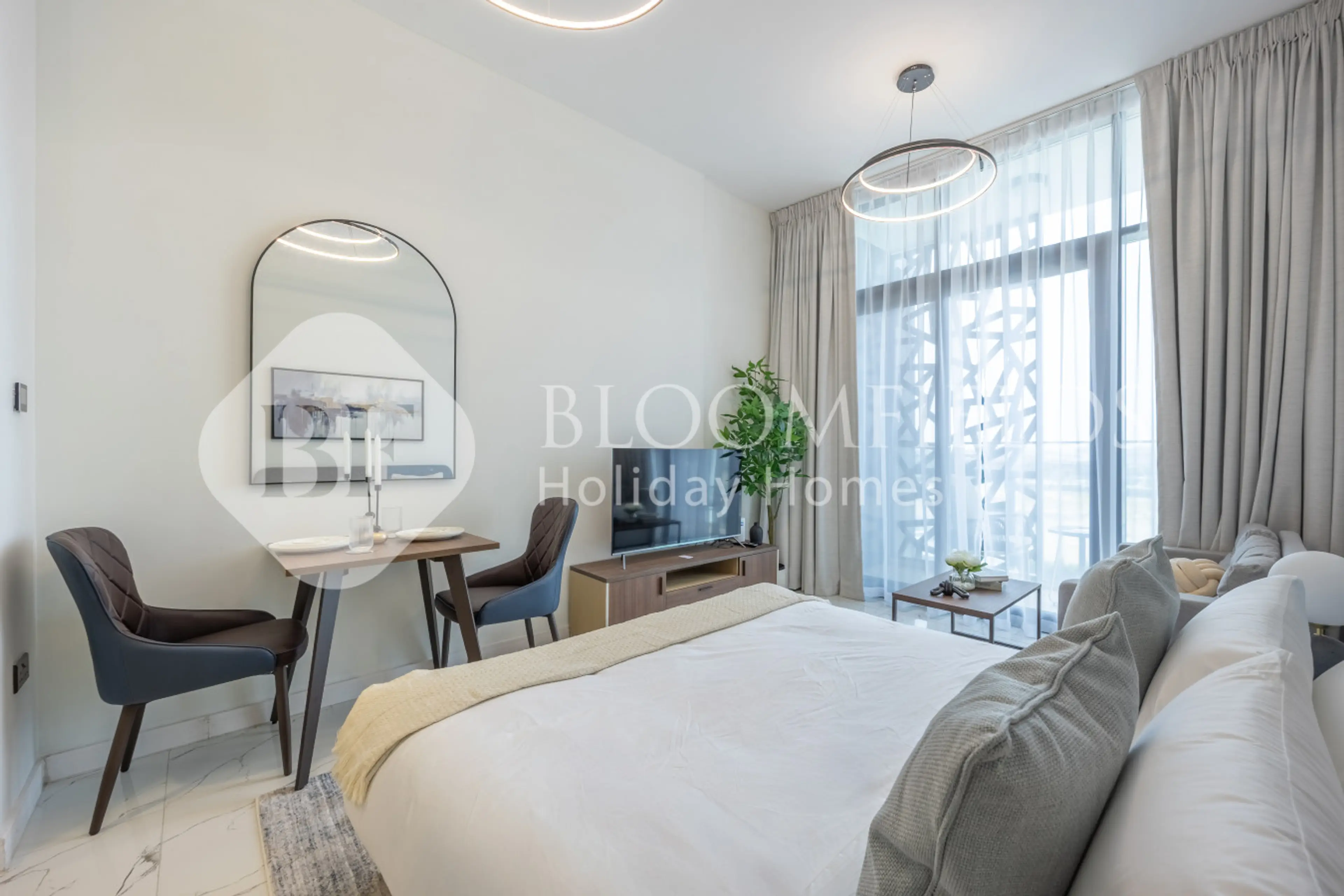 • Bright, designer studio with soft, airy interiors • Private balcony with lush, resort-style community • Floor-to-ceiling windows with abundant natural light • Elegant living space with Smart TV • Plush bed with hotel-quality linens • Fully equipped modern kitchen • Pool, gym & landscaped walkways ...